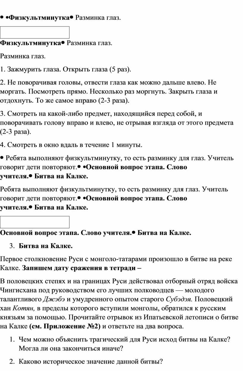 3. Битва на Калке. Первое столкновение Руси с монголо-татарами произошло в битве на реке Калке. Запишем дату сражения в тетради – В половецких степях и на границах Руси действовал отборный отряд войска Чингисхана под руководством его лучших полководцев — молодого талантливого Джэбэ и умудренного опытом старого Субэдэя. Половецкий хан Котян, в пределы которого вступили монголы, обратился к русским князьям за помощью. Прочитайте отрывок из Ипатьевской летописи о битве на Калке (см. Приложение №2) и ответьте на два вопроса. 1. Чем можно объяснить трагический для Руси исход битвы на Калке? Могла ли она закончиться иначе? 2. Каково историческое значение данной битвы?