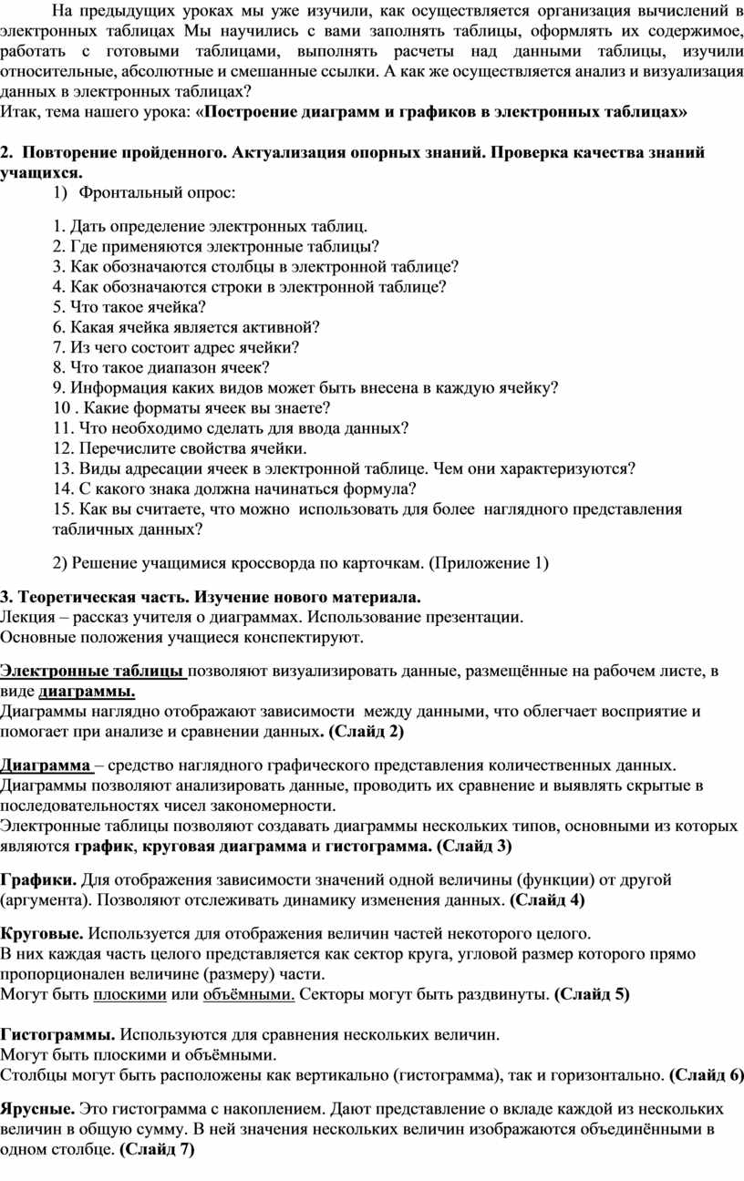 Электронные таблицы позволяют создавать диаграммы нескольких типов, основными из которых являются график, круговая диаграмма и гистограмма. (Слайд 3)
