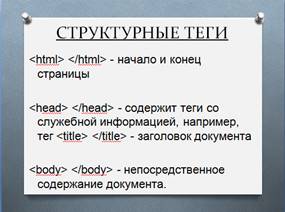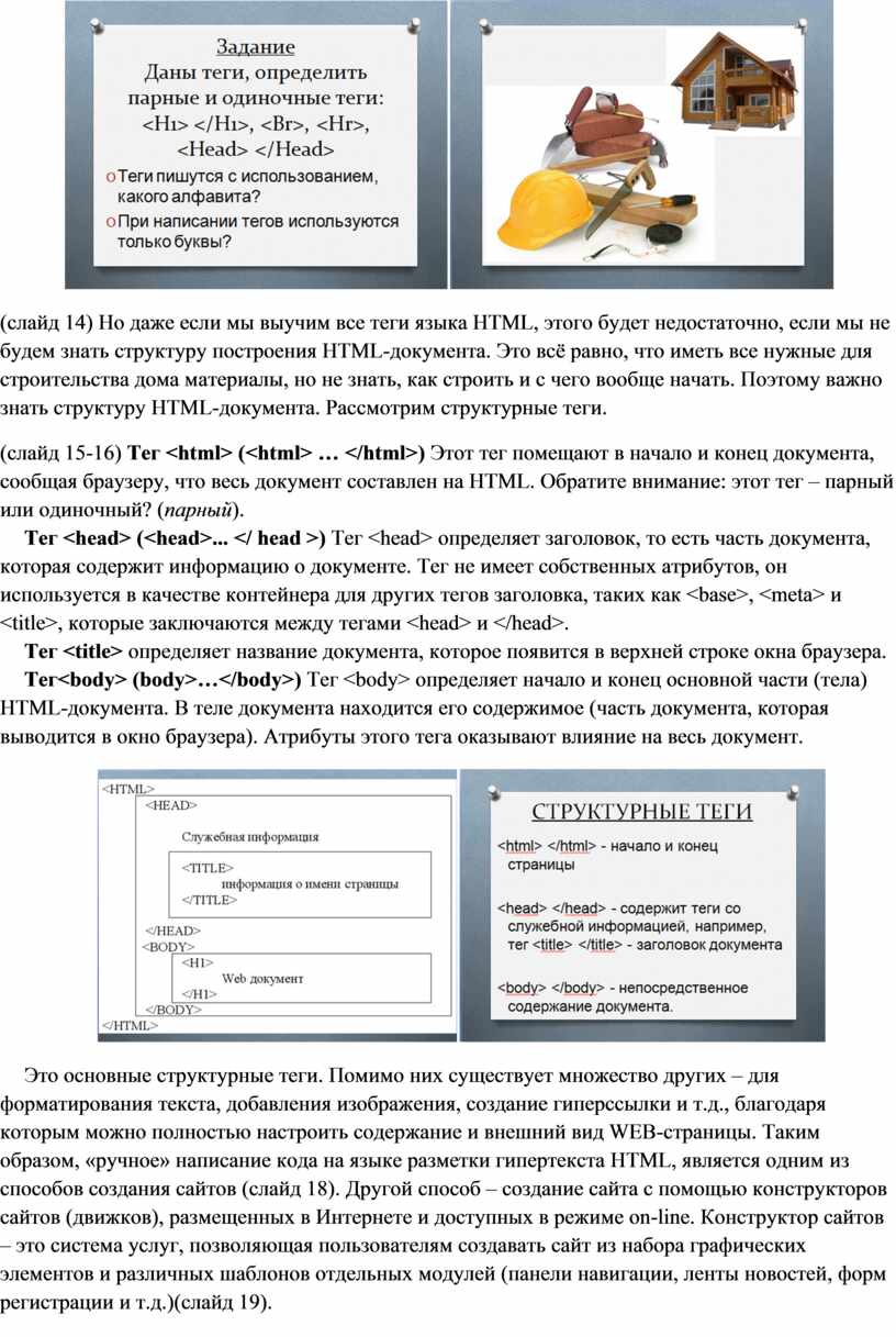 (слайд 14) Но даже если мы выучим все теги языка HTML, этого будет недостаточно, если мы не будем знать структуру построения HTML-документа. Это всё равно, что иметь все нужные для строительства дома материалы, но не знать, как строить и с чего вообще начать. Поэтому важно знать структуру HTML-документа. Рассмотрим структурные теги.