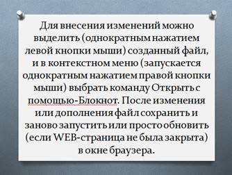 (слайд 27) Для внесения изменений можно выделить (однократным нажатием левой кнопки мыши) созданный файл, и в контекстном меню (запускается однократным нажатием правой кнопки мыши) выбрать команду Открыть с помощью-Блокнот. После изменения или дополнения файл сохранить и заново запустить или просто обновить (если WEB-страница не была закрыта) в окне браузера.