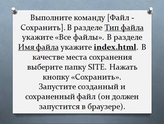 (слайд 24-25) В каталоге «Мои документы» создайте папку SITE. Откройте текстовый редактор Блокнот (Пуск - Все программы - Стандартные) и наберите текст, представленный ниже.