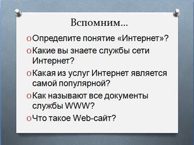 Ø Какие вы знаете службы сети Интернет? (электронная почта, интернет-магазины, чаты, интернет-телефония, интернет-радио, интернет-телевидение, телеконференции, служба World Wide Web)