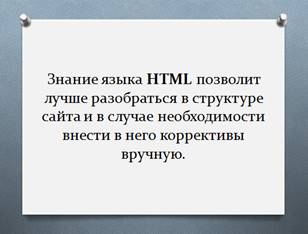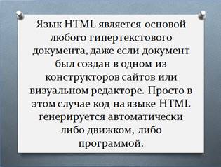 (слайд 21) Язык HTML является основой любого гипертекстового документа, даже если документ был создан в одном из конструкторов сайтов или визуальном редакторе. Просто в этом случае код на языке HTML генерируется автоматически либо движком, либо программой. Поэтому можно создать основу сайта (макет) с использованием визуального редактора, а затем доработать его, внеся непосредственно изменения с HTML-код. (слайд 22) В любом случае, знание языка HTML позволит лучше разобраться в структуре сайта и в случае необходимости внести в него коррективы вручную.