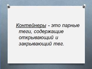 Теги могут быть парные и одиночные. Парные делятся на открывающие и закрывающие (слайд 11). Контейнеры- это парные теги, содержащие открывающий и закрывающий тег (слайд 12).