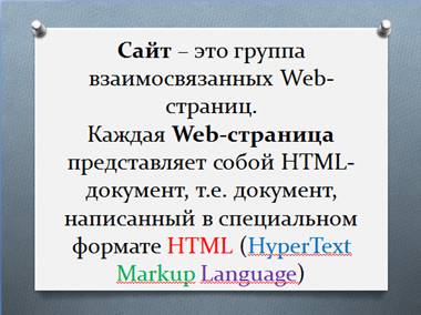 Итак, сайт – это группа взаимосвязанных Web-страниц, объединённых или единой тематикой, или единым авторством, или единым владельцем. Сайт состоит из Web- страниц. Каждая Web-страница представляет собой HTML-документ, т.е. документ, написанный в специальном формате HTML (HyperText Markup Language) (слайд 3).
