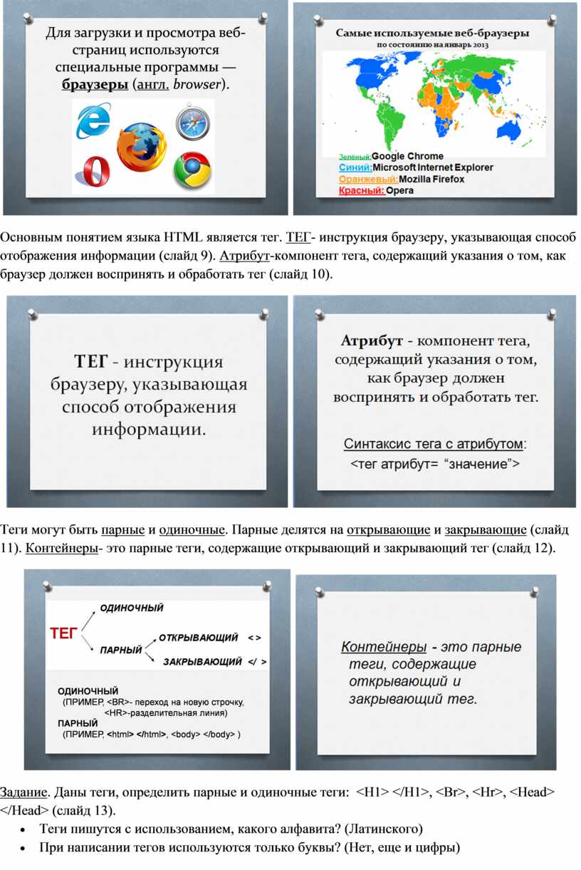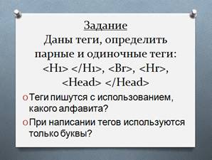 Задание. Даны теги, определить парные и одиночные теги: <H1> </H1>, <Br>, <Hr>, <Head> </Head> (слайд 13).