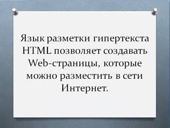 Т.е. язык разметки гипертекста HTML позволяет создавать Web-страницы, которые можно разместить в сети Интернет.