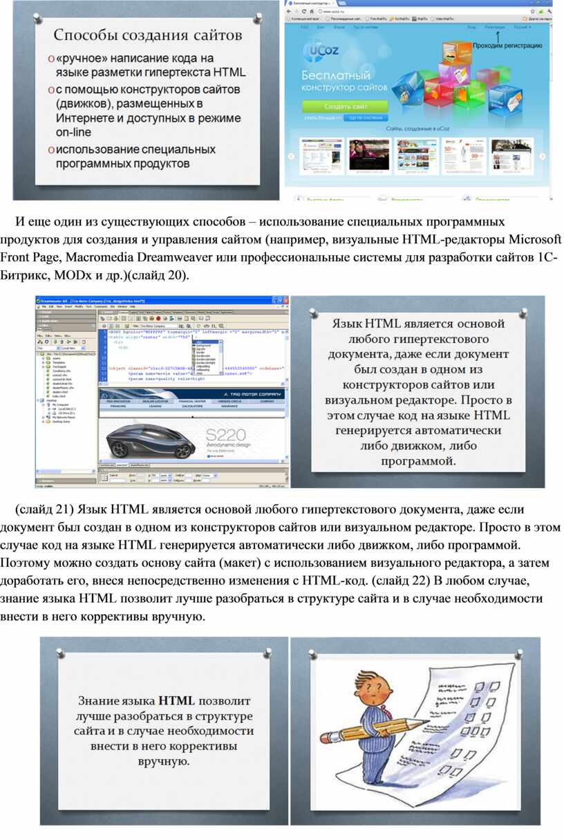 И еще один из существующих способов – использование специальных программных продуктов для создания и управления сайтом (например, визуальные HTML-редакторы Microsoft Front Page, Macromedia Dreamweaver или профессиональные системы для разработки сайтов 1C-Битрикс, MODx и др.)(слайд 20).