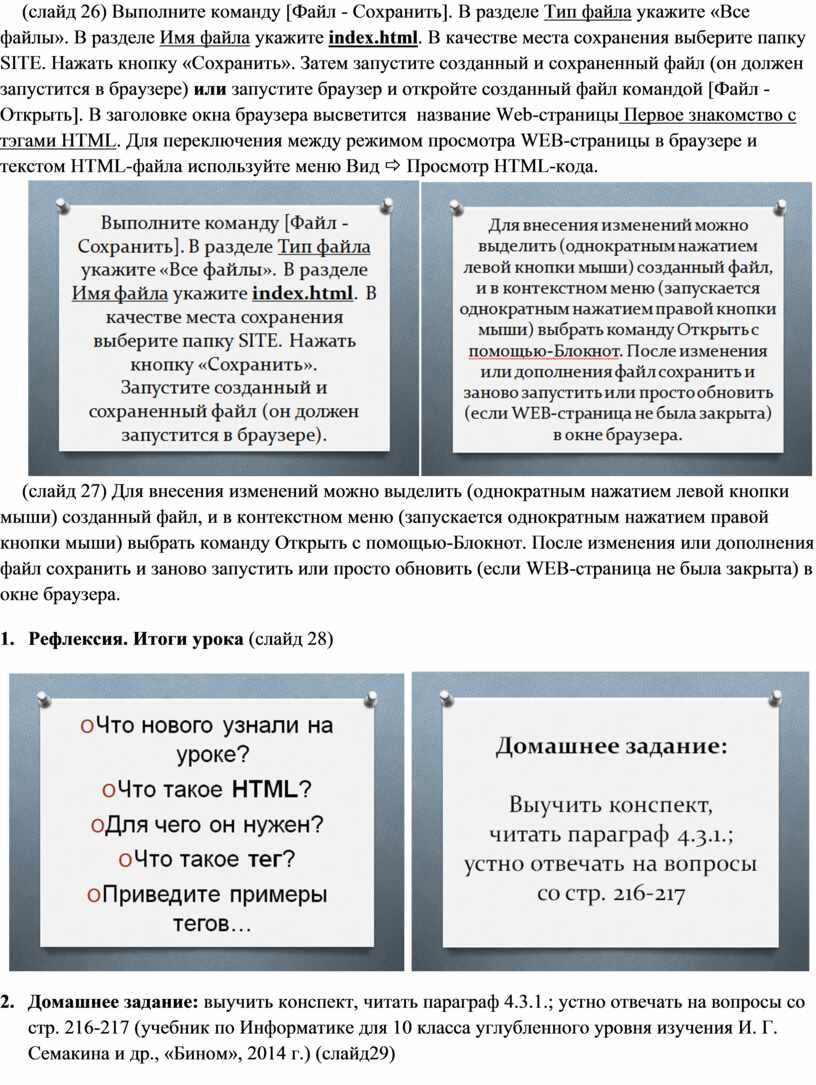 (слайд 26) Выполните команду [Файл - Сохранить]. В разделе Тип файла укажите «Все файлы». В разделе Имя файла укажите index.html. В качестве места сохранения выберите папку SITE. Нажать кнопку «Сохранить». Затем запустите созданный и сохраненный файл (он должен запустится в браузере) или запустите браузер и откройте созданный файл командой [Файл - Открыть]. В заголовке окна браузера высветится название Web-страницы Первое знакомство с тэгами HTML. Для переключения между режимом просмотра WEB-страницы в браузере и текстом HTML-файла используйте меню Вид ð Просмотр HTML-кода.