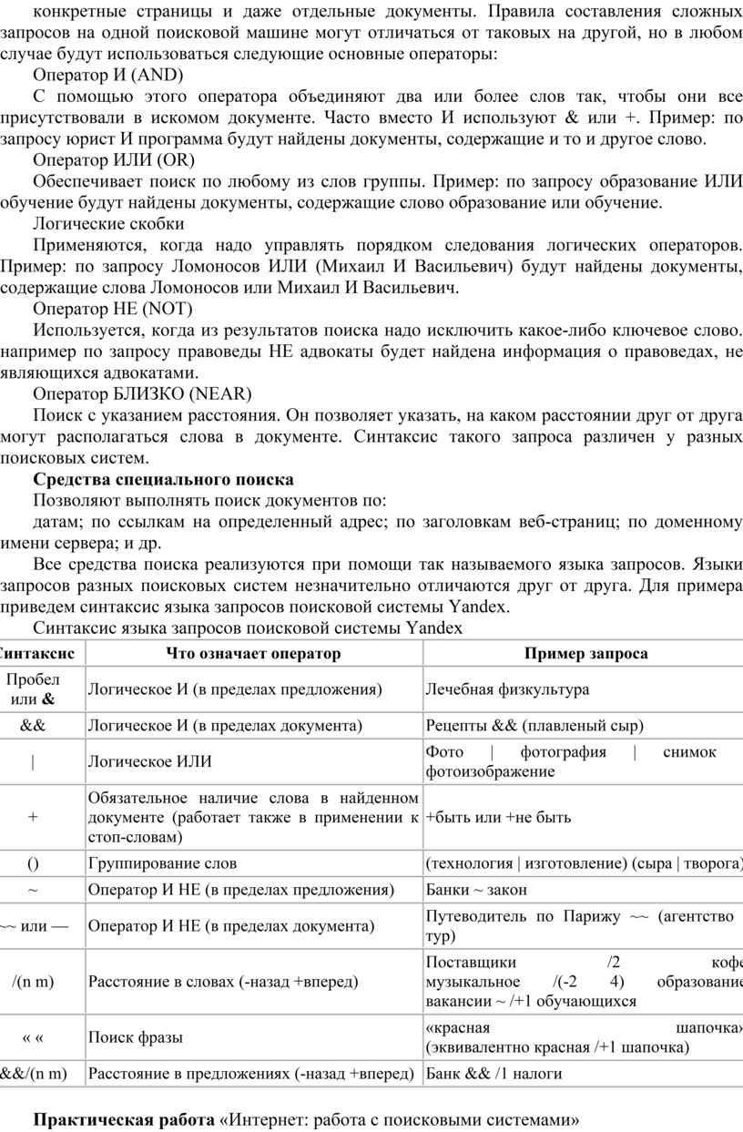 Для более быстрого и успешного поиска в поисковых машинах совместно с ключевыми словами используются различные логические операторы. Благодаря этому можно сконструировать запрос так, что будут найдены не сайты на интересующую тему, а конкретные страницы и даже отдельные документы. Правила составления сложных запросов на одной поисковой машине могут отличаться от таковых на другой, но в любом случае будут использоваться следующие основные операторы: