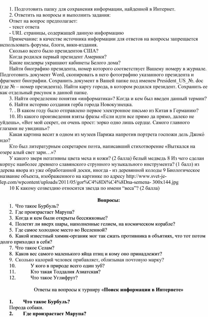 Ответы на вопросы к турниру «Поиск информации в Интернете»