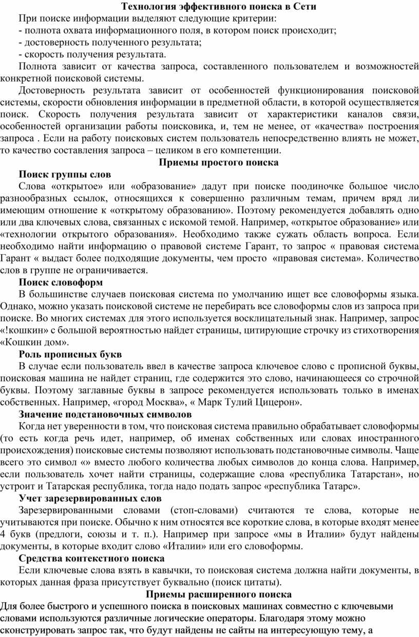 Слова «открытое» или «образование» дадут при поиске поодиночке большое число разнообразных ссылок, относящихся к совершенно различным темам, причем вряд ли имеющим отношение к «открытому образованию». Поэтому рекомендуется добавлять одно или два ключевых слова, связанных с искомой темой. Например, «открытое образование» или «технологии открытого образования». Необходимо также сужать область вопроса. Если необходимо найти информацию о правовой системе Гарант, то запрос « правовая система Гарант « выдаст более подходящие документы, чем просто «правовая система». Количество слов в группе не ограничивается.