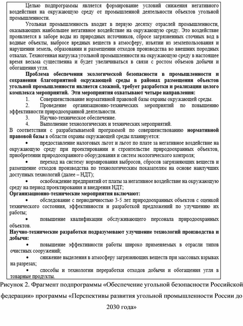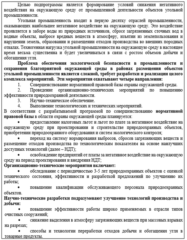 4. Фрагмент подпрограммы «Обеспечение экологической безопасности» программы «Перспективы развития угольной промышленности Российской Федерации до 2030 года» Министерства энергетики Российской Федерации (52-55 с.)