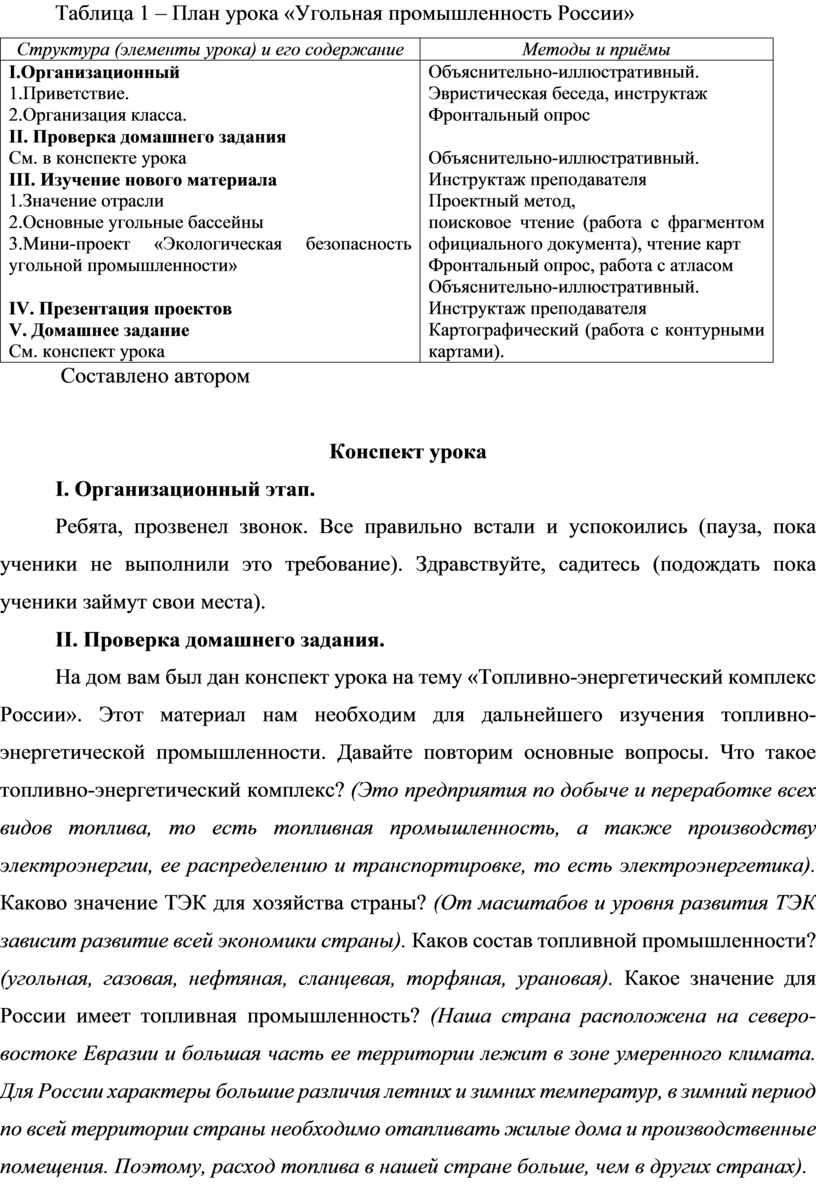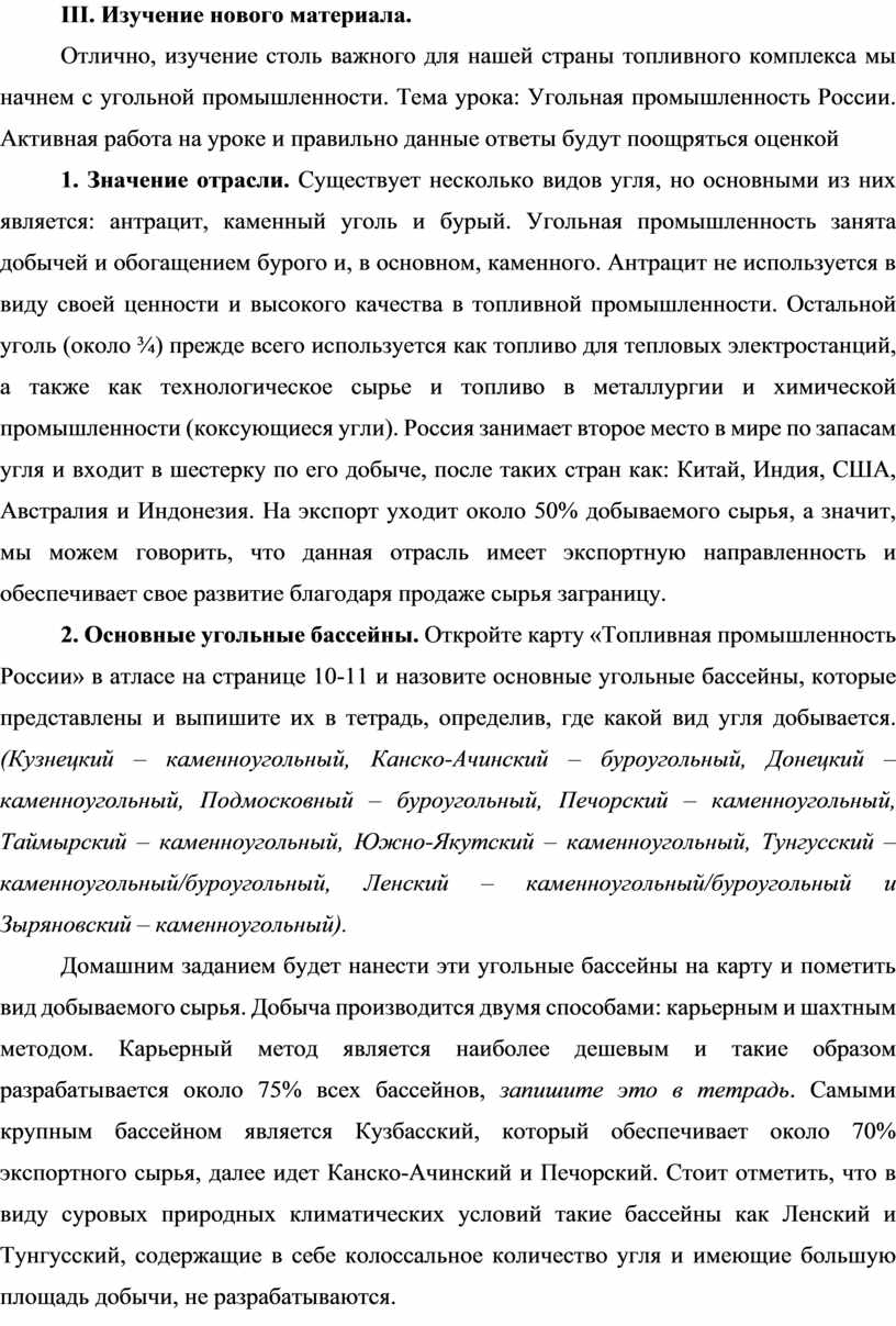 I.Организационный 1.Приветствие. 2.Организация класса. II. Проверка домашнего задания См. в конспекте урока III. Изучение нового материала 1.Значение отрасли 2.Основные угольные бассейны 3.Мини-проект «Экологическая безопасность угольной промышленности»