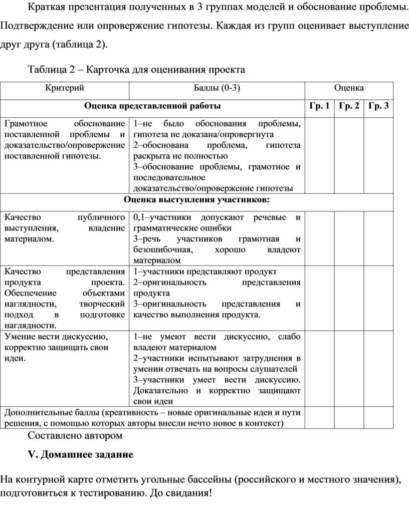 Краткая презентация полученных в 3 группах моделей и обоснование проблемы. Подтверждение или опровержение гипотезы. Каждая из групп оценивает выступление друг друга (таблица 2).