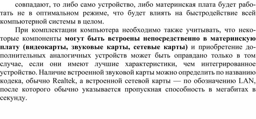 При комплектации компьютера необходимо также учитывать, что некоторые компоненты могут быть встроены непосредственно в материнскую плату (видеокарты, звуковые карты, сетевые карты) и приобретение дополнительных аналогичных устройств может быть оправдано только в том случае, если они имеют лучшие характеристики, чем интегрированное устройство. Наличие встроенной звуковой карты можно определить по названию кодека, обычно Realtek, а встроенной сетевой карты — по обозначению LAN, после которого обычно указывается пропускная способность в мегабитах в секунду.