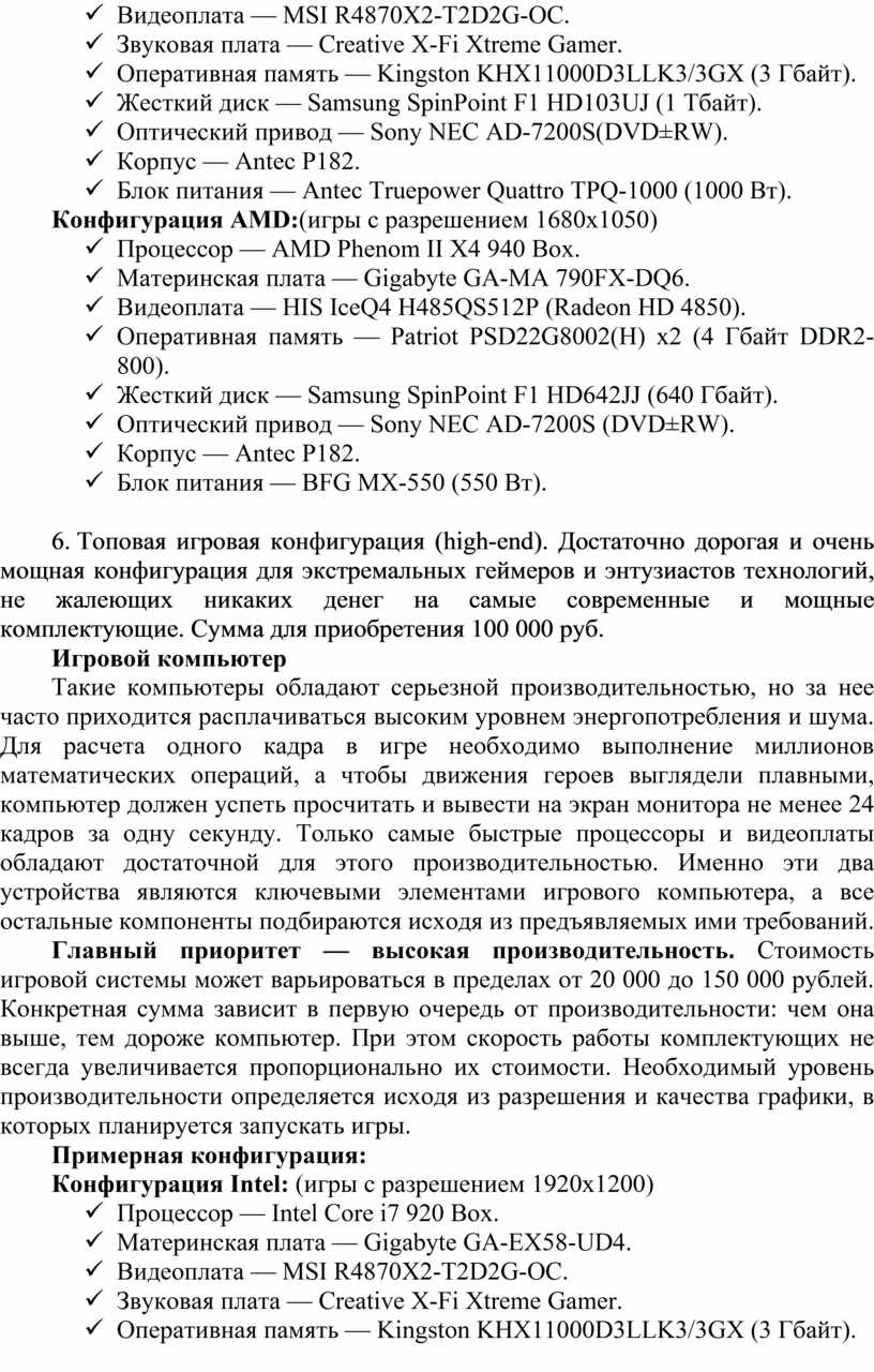 6. Топовая игровая конфигурация (high-end). Достаточно дорогая и очень мощная конфигурация для экстремальных геймеров и энтузиастов технологий, не жалеющих никаких денег на самые современные и мощные комплектующие. Сумма для приобретения 100 000 руб.