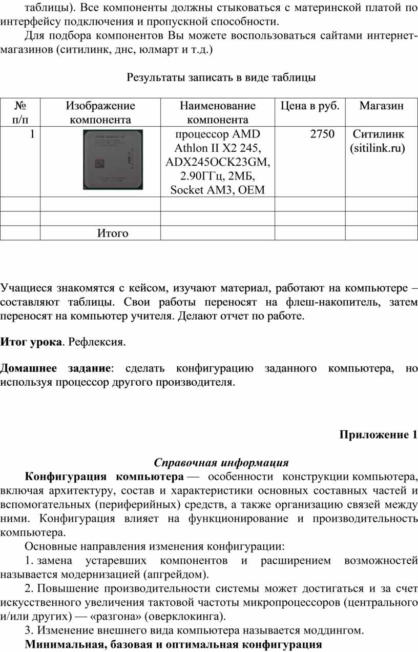 Знакомство с основными техническими характеристиками устройств персонального компьютера; знакомство с номенклатурой и символикой; знакомство с принципами комплектации компьютера при покупке ПК; получение навыков в оценке стоимости комплекта устройств ПК.