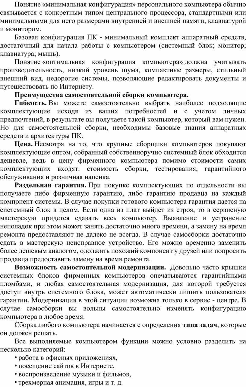 Понятие «минимальная конфигурация» персонального компьютера обычно связывается с конкретным типом центрального процессора, стандартными или минимальными для него размерами внутренней и внешней памяти, клавиатурой и монитором.