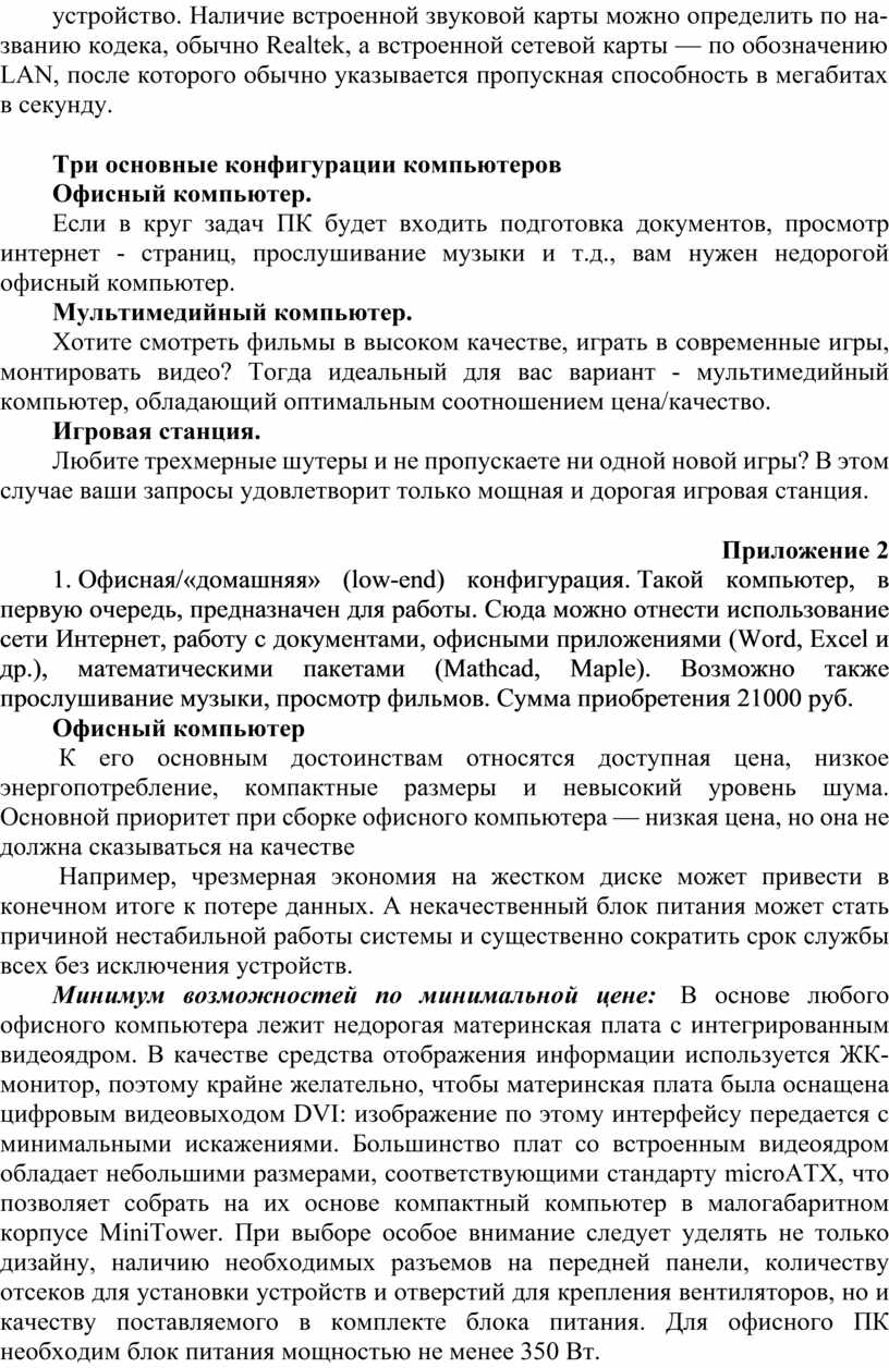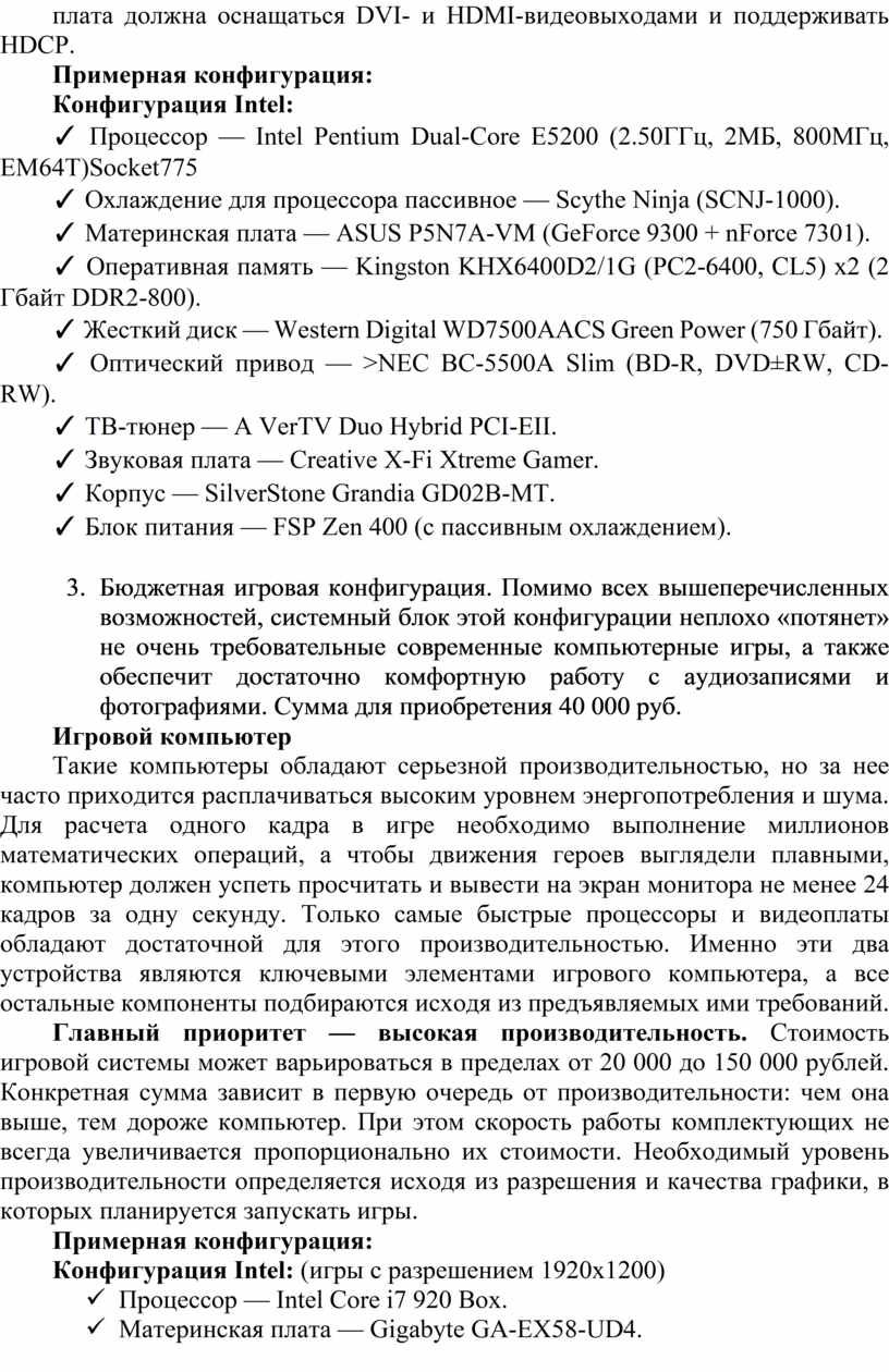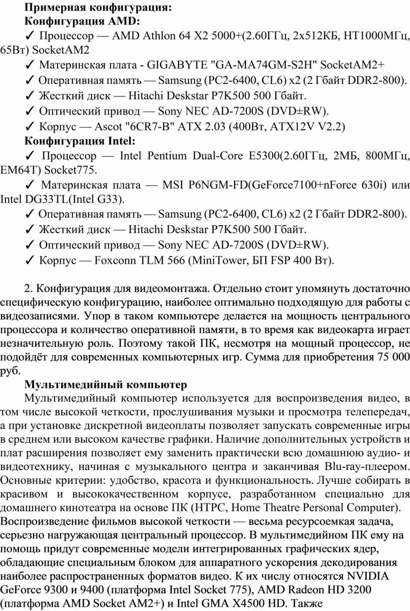 1. Офисная/«домашняя» (low-end) конфигурация. Такой компьютер, в первую очередь, предназначен для работы. Сюда можно отнести использование сети Интернет, работу с документами, офисными приложениями (Word, Excel и др.), математическими пакетами (Mathcad, Maple). Возможно также прослушивание музыки, просмотр фильмов. Сумма приобретения 21000 руб.