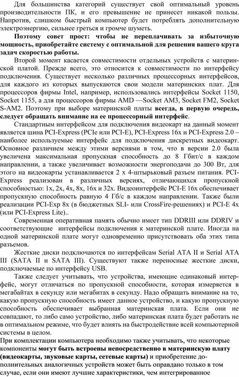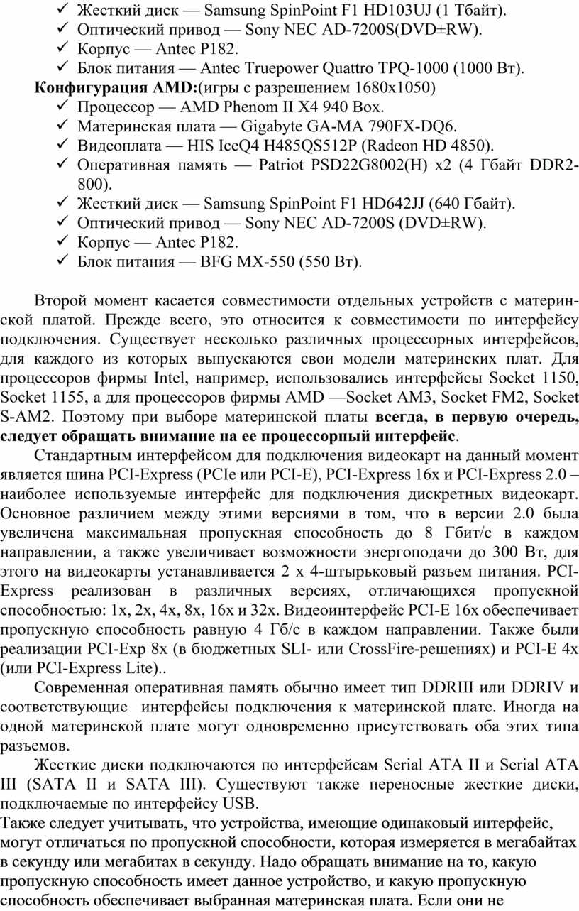 Второй момент касается совместимости отдельных устройств с материнской платой. Прежде всего, это относится к совместимости по интерфейсу подключения. Существует несколько различных процессорных интерфейсов, для каждого из которых выпускаются свои модели материнских плат. Для процессоров фирмы Intel, например, использовались интерфейсы Socket 1150, Socket 1155, а для процессоров фирмы AMD —Socket AM3, Socket FM2, Socket S-AM2. Поэтому при выборе материнской платы всегда, в первую очередь, следует обращать внимание на ее процессорный интерфейс.