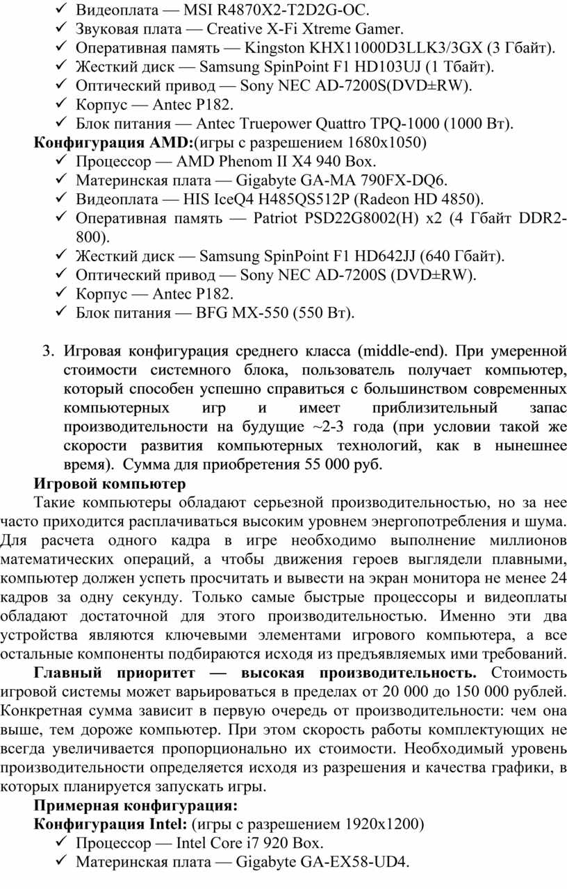 4. Игровая конфигурация среднего класса (middle-end). При умеренной стоимости системного блока, пользователь получает компьютер, который способен успешно справиться с большинством современных компьютерных игр и имеет приблизительный запас производительности на будущие ~2-3 года (при условии такой же скорости развития компьютерных технологий, как в нынешнее время). Сумма для приобретения 55 000 руб.
