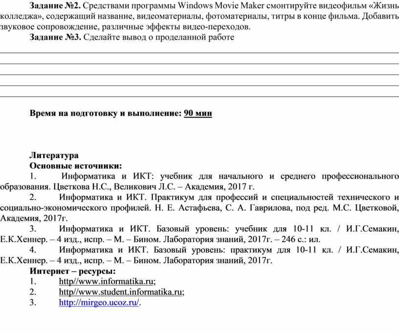 Задание №2. Средствами программы Windows Movie Maker смонтируйте видеофильм «Жизнь колледжа», содержащий название, видеоматериалы, фотоматериалы, титры в конце фильма. Добавить звуковое сопровождение, различные эффекты видео-переходов.