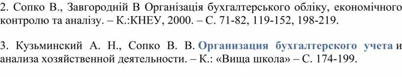 2. Сопко В., Завгородній В Організація бухгалтерського обліку, економічного контролю та аналізу. – К.:КНЕУ, 2000. – С. 71-82, 119-152, 198-219.