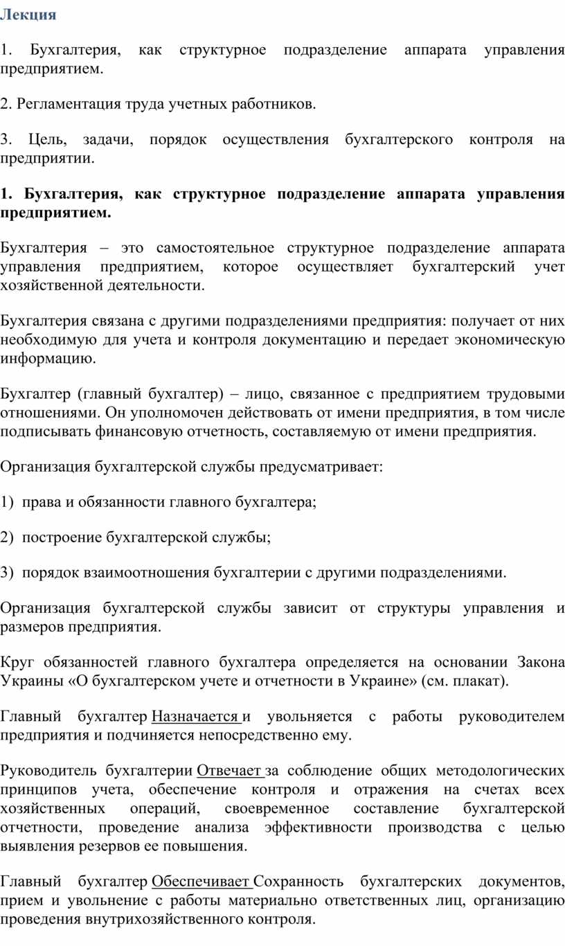 1. Бухгалтерия, как структурное подразделение аппарата управления предприятием.