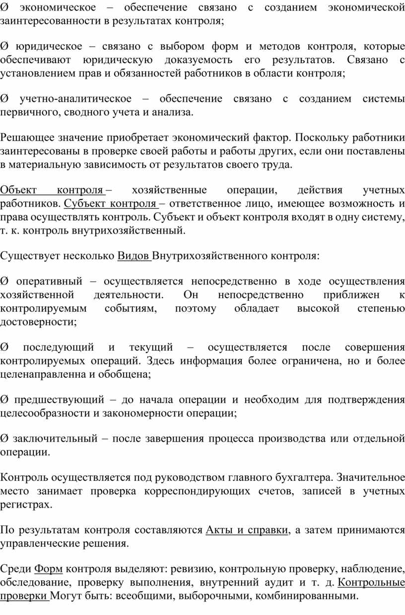 Ø экономическое – обеспечение связано с созданием экономической заинтересованности в результатах контроля;