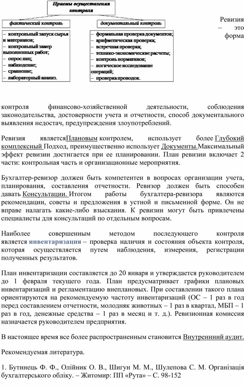 Ревизия являетсяПлановым контролем, использует более Глубокий комплексный Подход, преимущественно использует Документы.Максимальный эффект ревизии достигается при ее планировании. План ревизии включает 2 части: контрольная часть и организационные мероприятия.