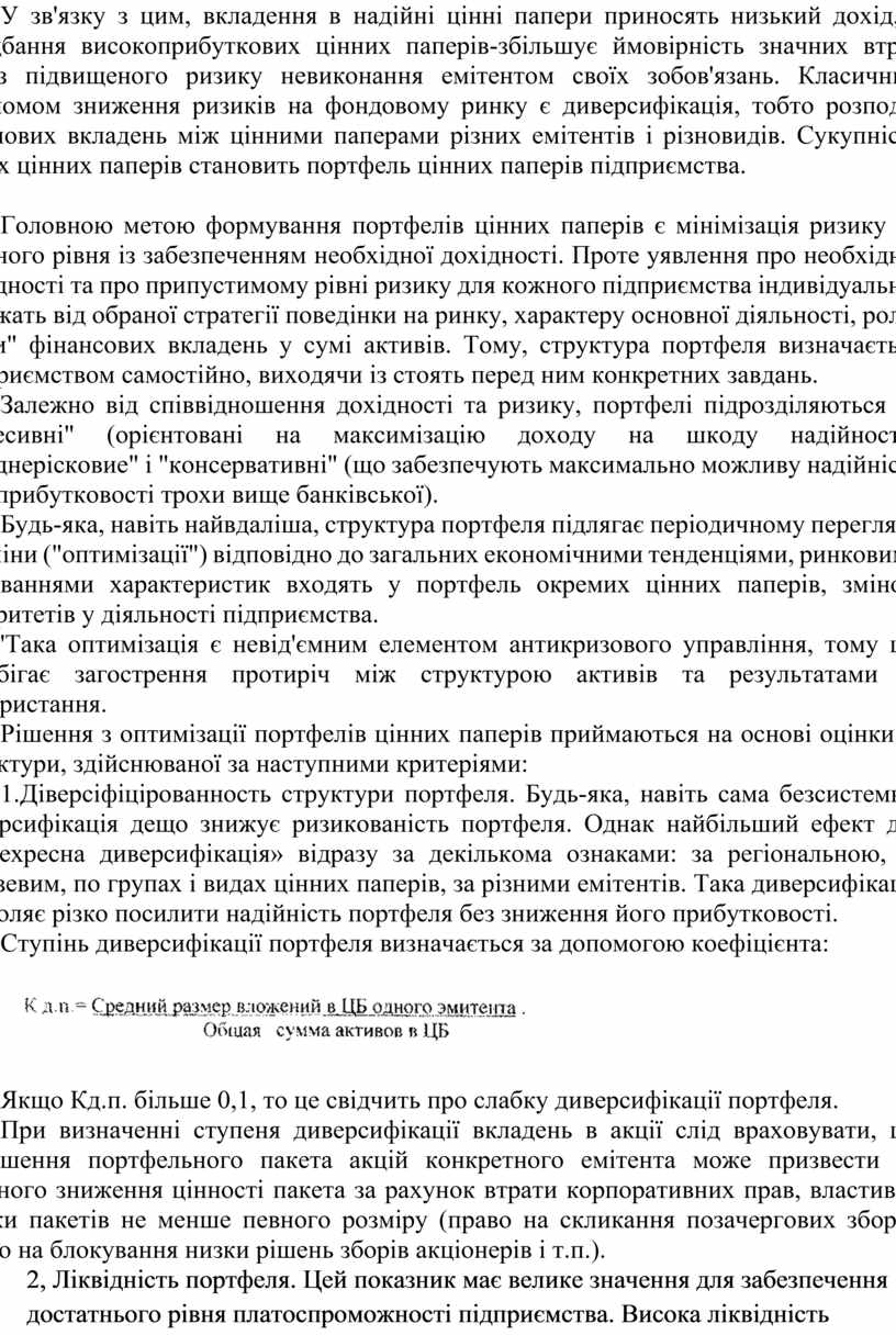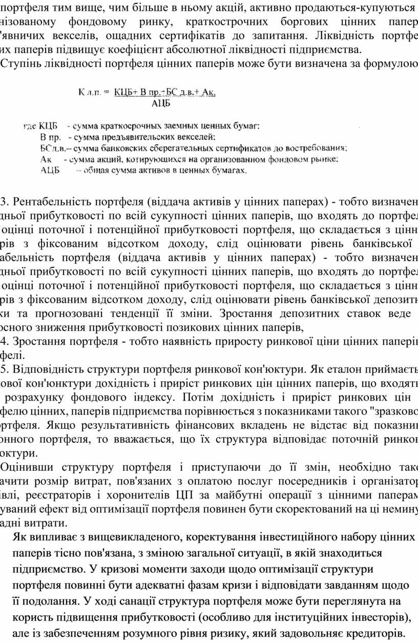 2, Ліквідність портфеля. Цей показник має велике значення для забезпечення достатнього рівня платоспроможності підприємства. Висока ліквідність портфеля дозволяє підприємству швидко обмінювати цінні папери на грошові кошти-Ліквідність портфеля тим вище, чим більше в ньому акцій, активно продаються-купуються на організованому фондовому ринку, краткострочних боргових цінних паперів, пред'явничих векселів, ощадних сертифікатів до запитання. Ліквідність портфеля цінних паперів підвищує коефіцієнт абсолютної ліквідності підприємства.
