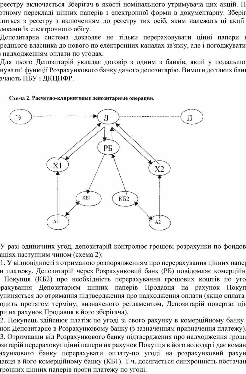 1. У відповідності з отриманою розпорядженням про перерахування цінних паперів проти платежу. Депозитарій через Розрахунковий банк (РБ) повідомляє комерційний банк Покупця (КБ2) про необхідність перерахування грошових коштів по угоді. Перерахування Депозитарієм цінних паперів Продавця на рахунок Покупця призупиняється до отримання підтвердження про надходження оплати (якщо оплата не надходить протягом терміну, визначеного регламентом, Депозитарій повертає цінні папери на рахунок Продавця в його зберігача).