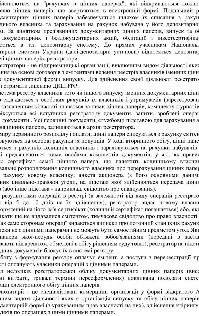 Депозитарії - це спеціалізовані комерційні організації у формі відкритого АТ. виключним видом діяльності яких є організація випуску та обігу цінних паперів в бездокументарній формі (з урахуванням прав власності на них), здійснення клірингу та розрахунків по операціях з цими цінними паперами.