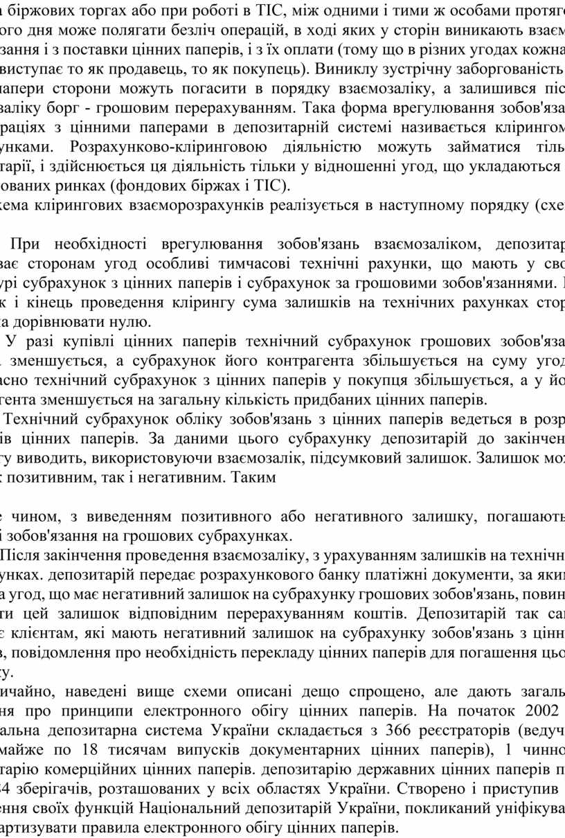 Звичайно, наведені вище схеми описані дещо спрощено, але дають загальне уявлення про принципи електронного обігу цінних паперів. На початок 2002 р. Національна депозитарна система України складається з 366 реєстраторів (ведучих облік майже по 18 тисячам випусків документарних цінних паперів), 1 чинного депозитарію комерційних цінних паперів. депозитарію державних цінних паперів при НБУ, 84 зберігачів, розташованих у всіх областях України. Створено і приступив до здійснення своїх функцій Національний депозитарій України, покликаний уніфікувати і стандартизувати правила електронного обігу цінних паперів.