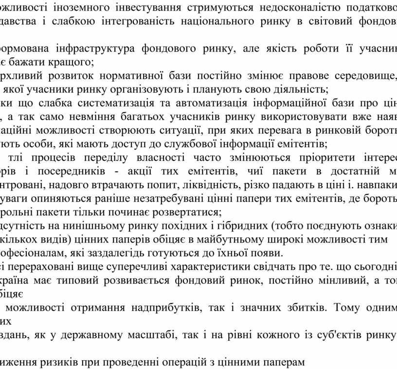 можливості іноземного інвестування стримуються недосконалістю податкового законодавства і слабкою інтегрованість національного ринку в світовий фондовий ринок: