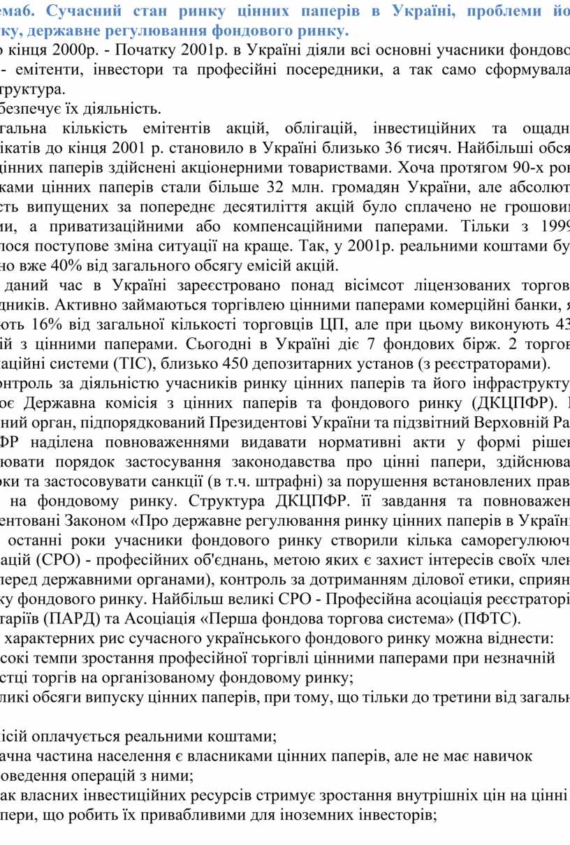 Тема6. Сучасний стан ринку цінних паперів в Україні, проблеми його розвитку, державне регулювання фондового ринку.