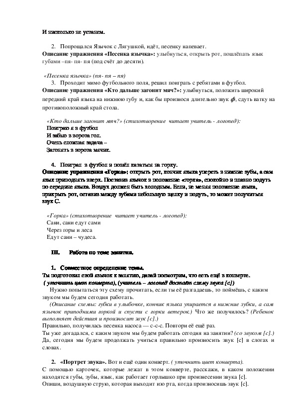 Цель: закрепление навыка правильного произношения звука [с] в слогах и словах.