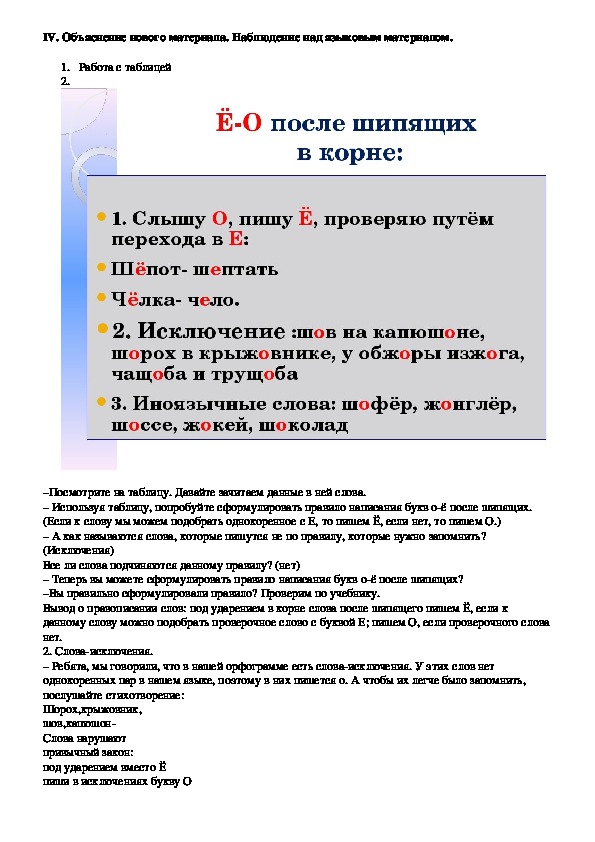 – Мы научимся определять, какую гласную мы пишем после шипящих в корне слова, О или Ё.IV. Объяснение нового материала. Наблюдение над языковым материалом.