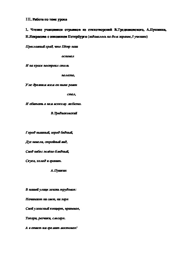 Н.Некрасова с описанием Петербурга (задавалось на дом заранее,3 ученика)