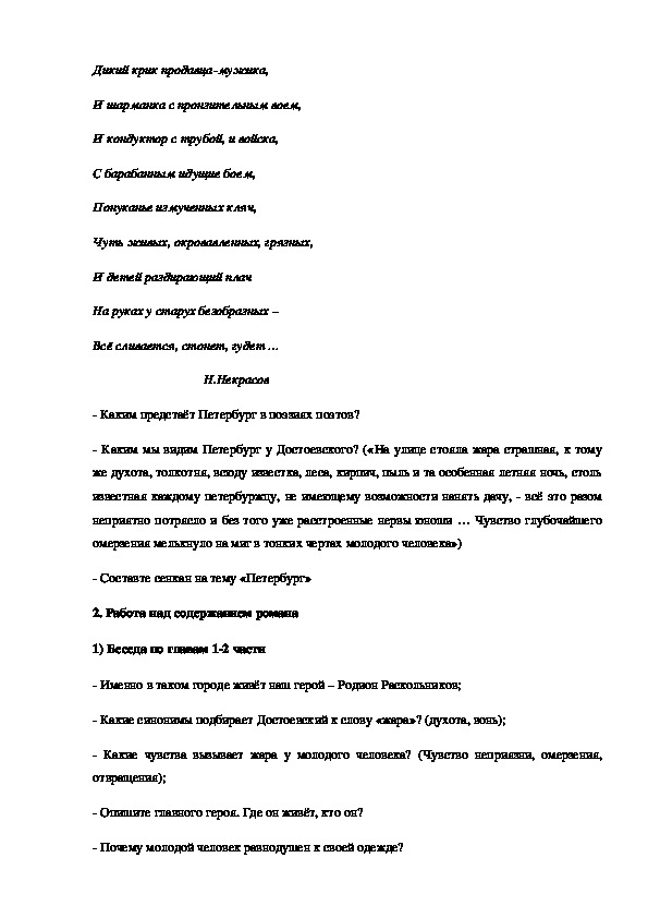Цели: проанализировать 1 часть романа, обратить внимание на изображение реальных картин действительности; показать плачевное положение молодых людей бедных районов Петербурга; учить анализировать поступки героя и делать правильные выводы; пробудить интерес к прочтению всего произведения; воспитывать сострадание, гуманизм, уважение к личности; развивать логическое мышление, грамотную связную речь учащихся.