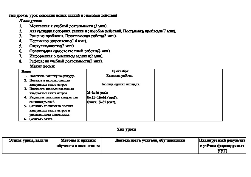 Цель: формирование познавательных УУД в процессе ознакомления обучающихся с нахождением площадей фигур с