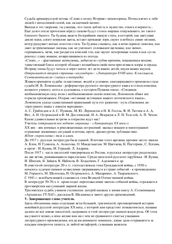 Открывается вторая страница «календаря»: «Литература XVIII века. Классицизм.