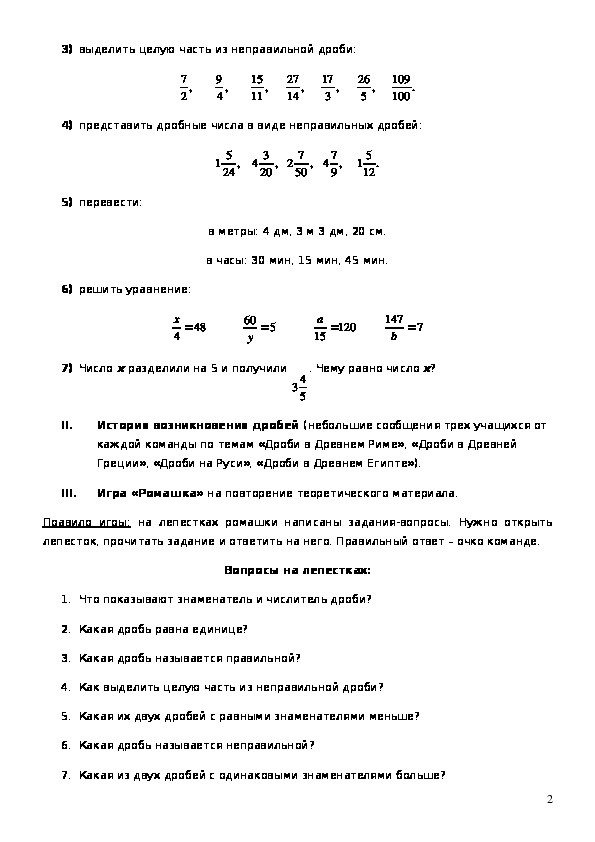 каждой команды по темам «Дроби в Древнем Риме», «Дроби в Древней