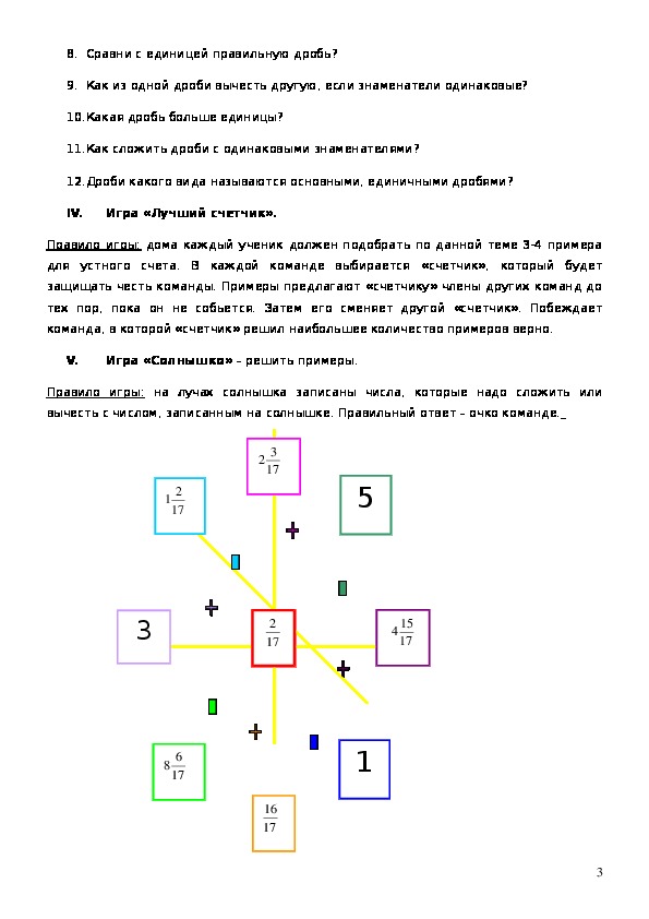 вычесть с числом, записанным на солнышке. Правильный ответ – очко команде.