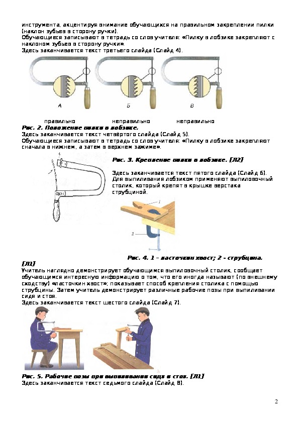 струбцины. Затем учитель демонстрирует различные рабочие позы при выпиливании
