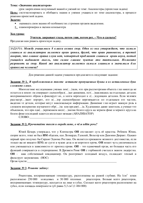 урок закрепления полученный знаний и умений по теме: Анализаторы.(проектная задача)