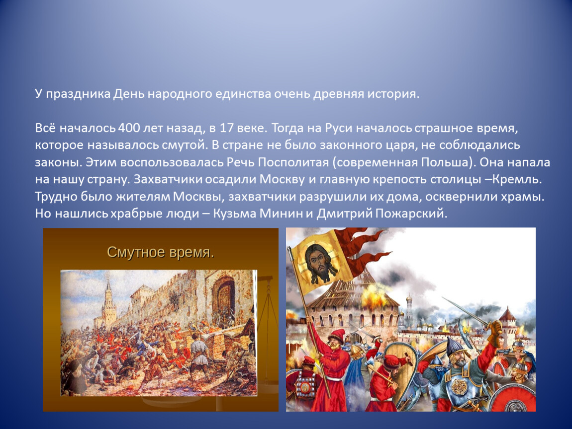 Всё началось 400 лет назад, в 17 веке. Тогда на Руси началось страшное время, которое называлось смутой. В стране не было законного царя, не соблюдались законы. Этим воспользовалась Речь Посполитая (современная Польша). Она напала на нашу страну. Захватчики осадили Москву и главную крепость столицы –Кремль. Трудно было жителям Москвы, захватчики разрушили их дома, осквернили храмы. Но нашлись храбрые люди – Кузьма Минин и Дмитрий Пожарский.