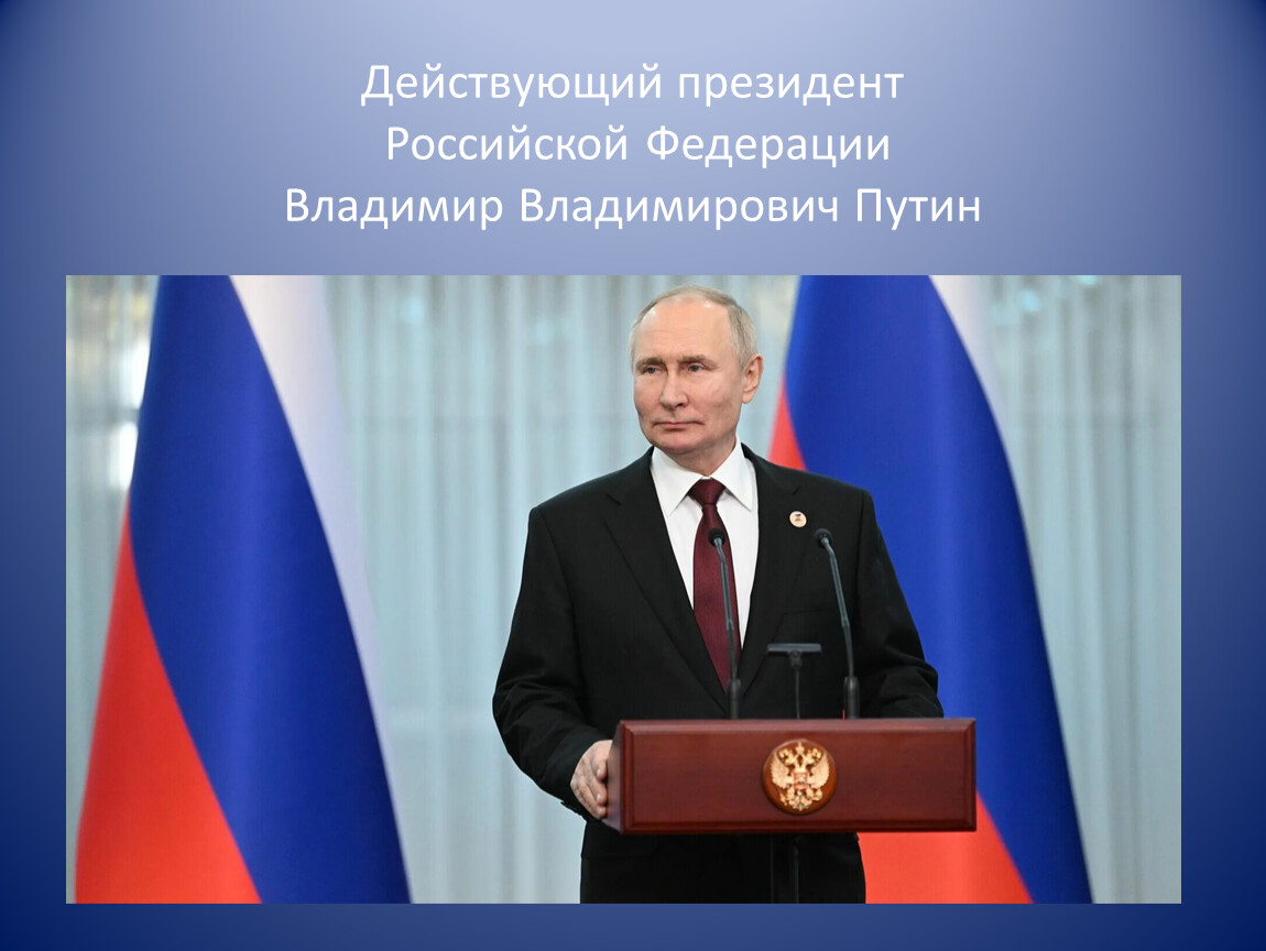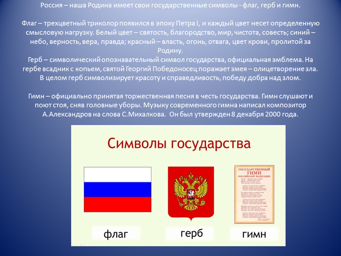 Россия – наша Родина имеет свои государственные символы - флаг, герб и гимн. Флаг – трехцветный триколор появился в эпоху Петра I, и каждый цвет несет определенную смысловую нагрузку. Белый цвет – святость, благородство, мир, чистота, совесть; синий – небо, верность, вера, правда; красный – власть, огонь, отвага, цвет крови, пролитой за Родину. Герб – символический опознавательный символ государства, официальная эмблема. На гербе всадник с копьем, святой Георгий Победоносец поражает змея – олицетворение зла. В целом герб символизирует красоту и справедливость, победу добра над злом.Гимн – официально принятая торжественная песня в честь государства. Гимн слушают и поют стоя, сняв головные уборы. Музыку современного гимна написал композитор А.Александров на слова С.Михалкова. Он был утвержден 8 декабря 2000 года.
