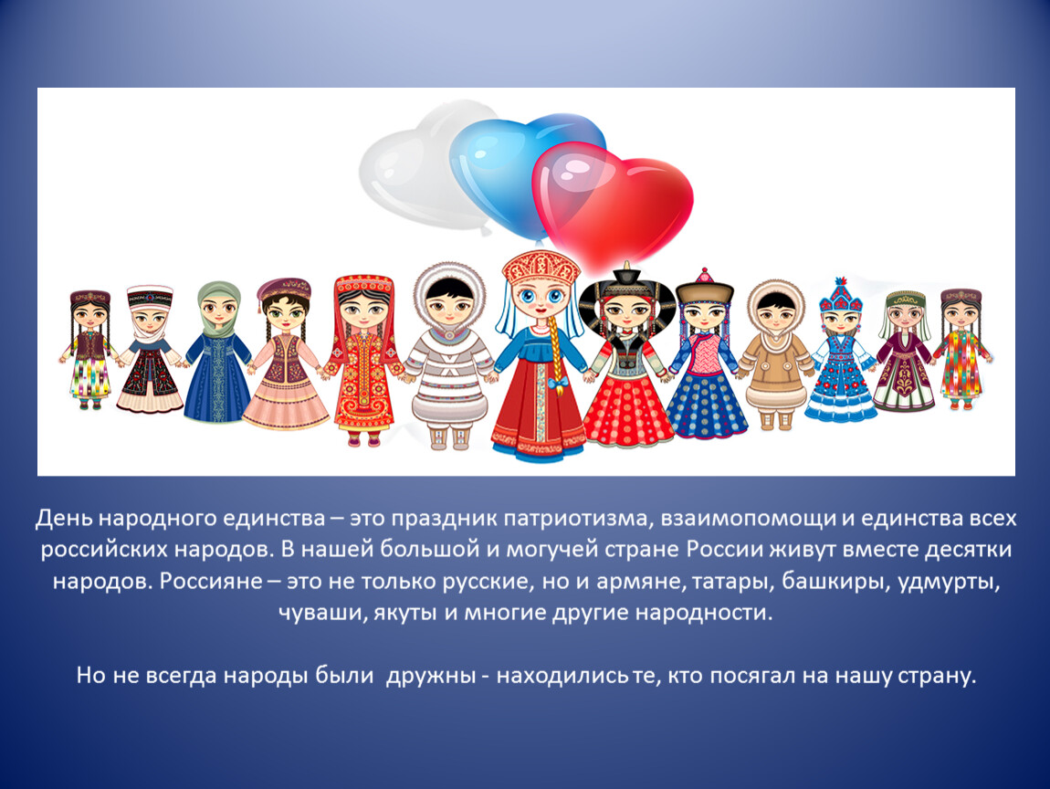 День народного единства – это праздник патриотизма, взаимопомощи и единства всех российских народов. В нашей большой и могучей стране России живут вместе десятки народов. Россияне – это не только русские, но и армяне, татары, башкиры, удмурты, чуваши, якуты и многие другие народности. Но не всегда народы были дружны - находились те, кто посягал на нашу страну.